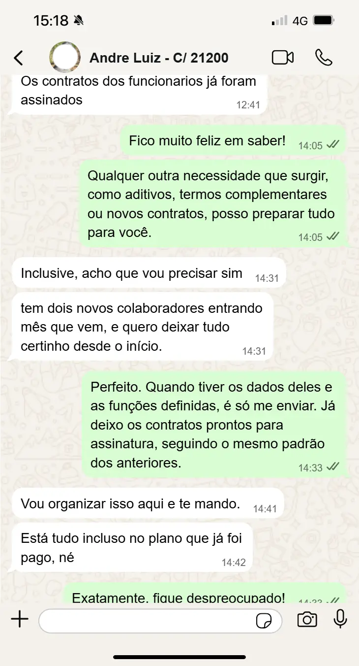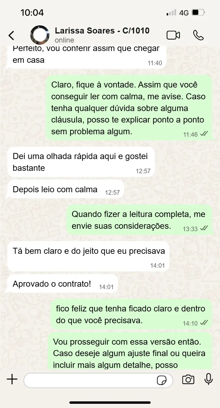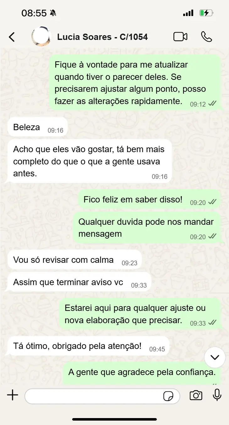 Logo após a coleta das informações essenciais, o seu contrato começa a ser elaborado. Em média, entregamos a versão final revisada entre 2 e 7 dias úteis, dependendo da complexidade do documento.